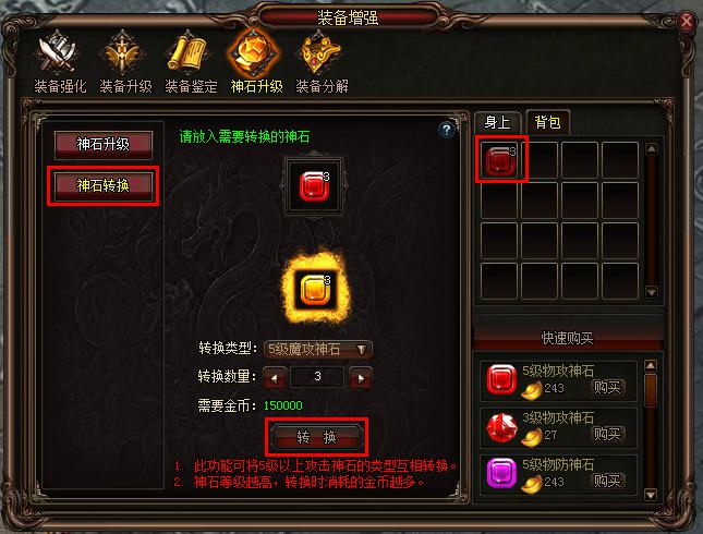 神石转换:转换攻击魂石的类型,获得更适合自身职业的神石;