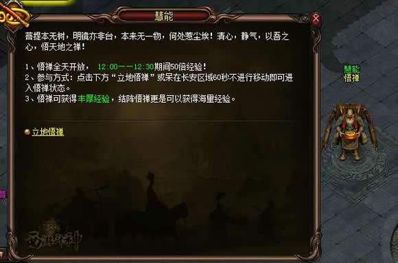 2、 到长安城NPC慧能打开悟禅面板,点击面板上“立地悟禅”或者呆在长安城区域60秒不进行移动即可进入悟禅状态。