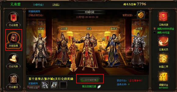 报名:打开行会页面,选择左侧的“攻城信息”,点击“今日攻城安排”会弹出申请报名窗口。
