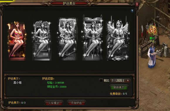 你可以点击“开始护送”按钮开始护送,亦可以通过“刷新美女”尝试获得更高品质美女护送,美女品质越高,护送完成奖励越丰厚。