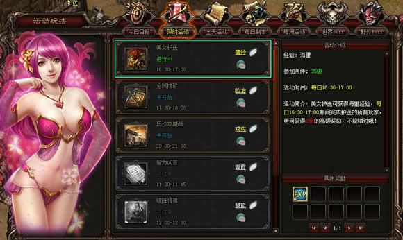 在“活动玩法”界面上切换到“限时活动”页中可找到“美女护送”活动简介,可点击NPC名称进入自动寻路并支持快速传送哦