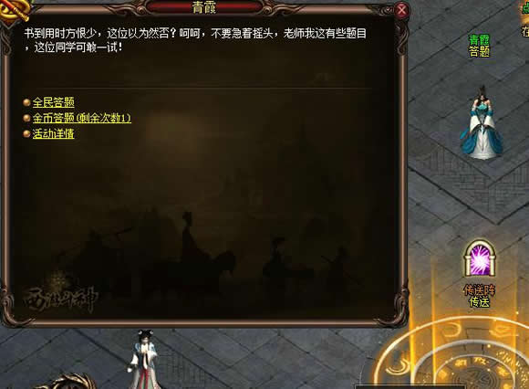 答题管理员青霞位于长安城,在她这里可以在非答题活动时间开启金币答题,赢取额外的经验